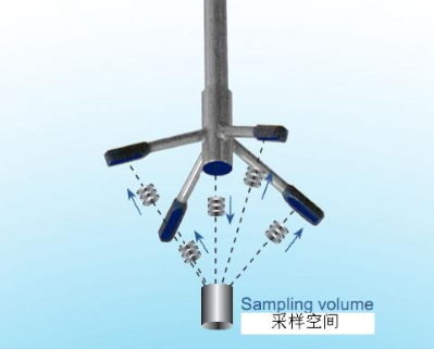 聲波脈沖從中間 的換能器發送,聲波在測 量空間經過水體中的粒 子散射,由另外四個接收 器接收測量其變化。