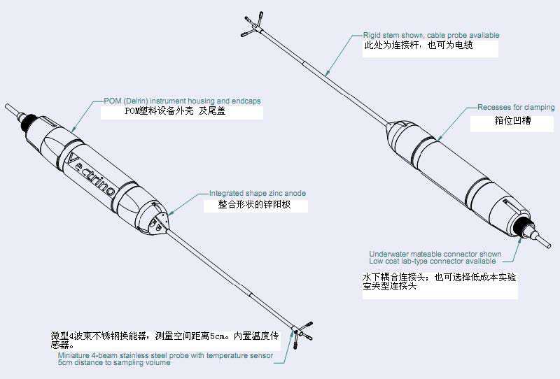 Vectrino 根據多普勒效應通過發送一個短的聲波脈沖, 并監聽其回波測量回波的強度及頻率變化來進行流速的測量。